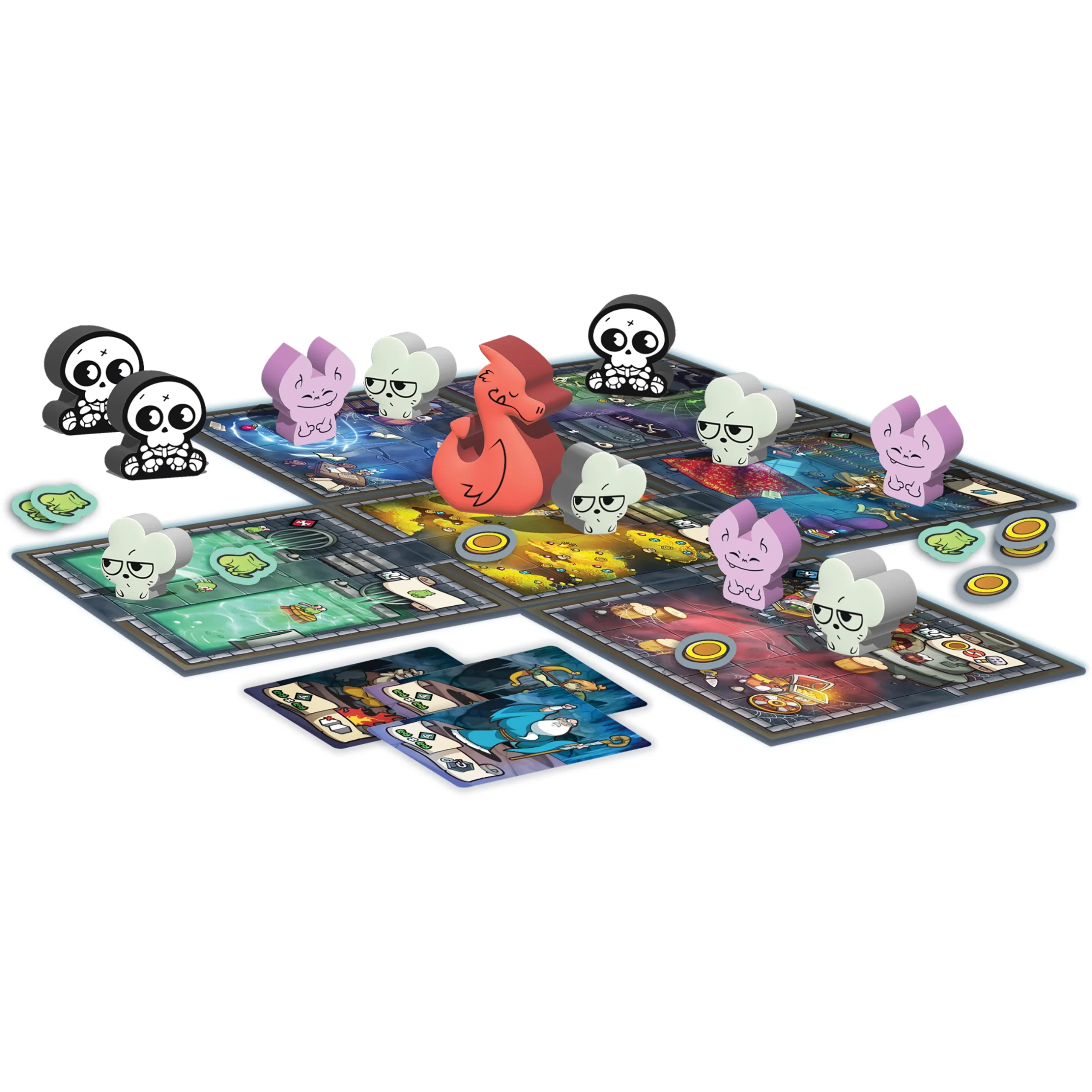 Prügelt euch durch verschiedene Szenarien und macht den Helden ein für alle Mal kar, dass dies hier euer zu Hause ist! In einem Zug zieht ihr 5 Karten und spielt diese möglichst clever aus. Eure Handkarten erlauben es euch, euch zu bewegen, die Spielsteine zu aktivieren, die Aktionen der Spielsteine auszuführen, Helden anzugreifen und Einheiten zu bewegen. Nach jedem Spieler werden Karten vom Heldenstapel gezogen und ausgeführt. Euer Ziel als Team in jedem Szenario ist es, die 3 Stufen der Bedrohung durch die eindringenden Helden zu überleben, indem ihr die Schätze in jedem Raum beschützt. Wenn der Hauptschatz geklaut wird, endet das Spiel und ihr verliert, aber wenn ihr es schafft, die Schätze lange genug zu schützen, gewinnt ihr alle.