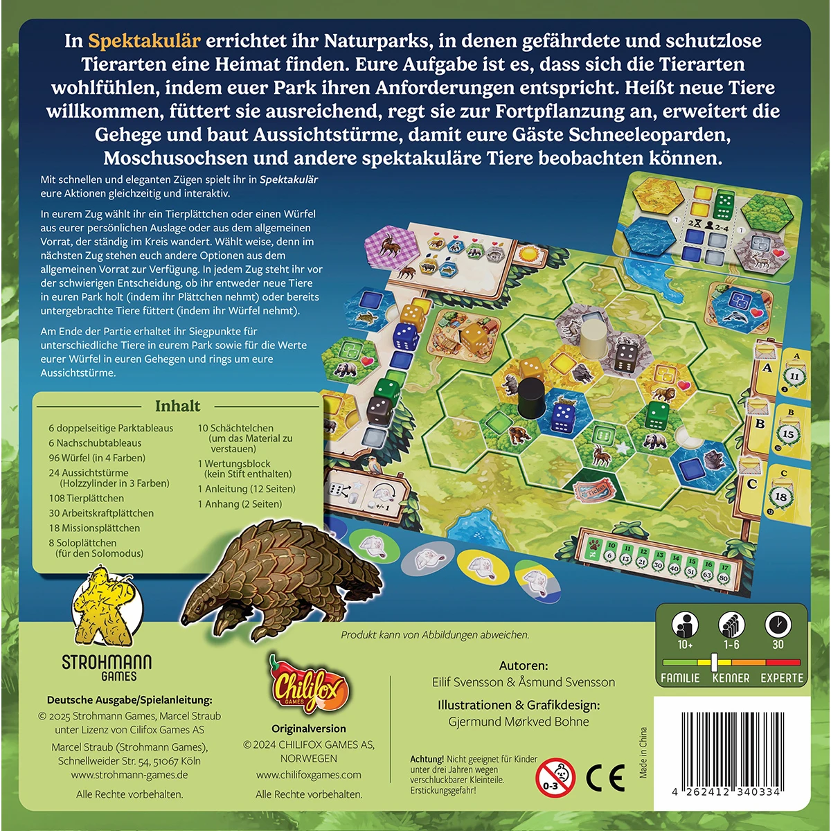 Spektakulär ist ein Drafting- und Plättchenlegespiel, in dem ihr eure Aktionen gleichzeitig ausführt. In eurem Zug wählt ihr ein Tierplättchen oder einen Würfel aus eurer persönlichen Auslage oder aus dem sich im Kreis bewegenden allgemeinen Vorrat. Wählt weise, denn im nächsten Zug stehen euch andere Optionen zur Verfügung! Ihr steht in jedem Zug erneut vor der schwierigen Entscheidung, ob ihr entweder neue Tiere in euren Park holt (indem ihr Plättchen nehmt) oder bereits untergebrachte Tiere füttert (indem ihr Würfel nehmt).