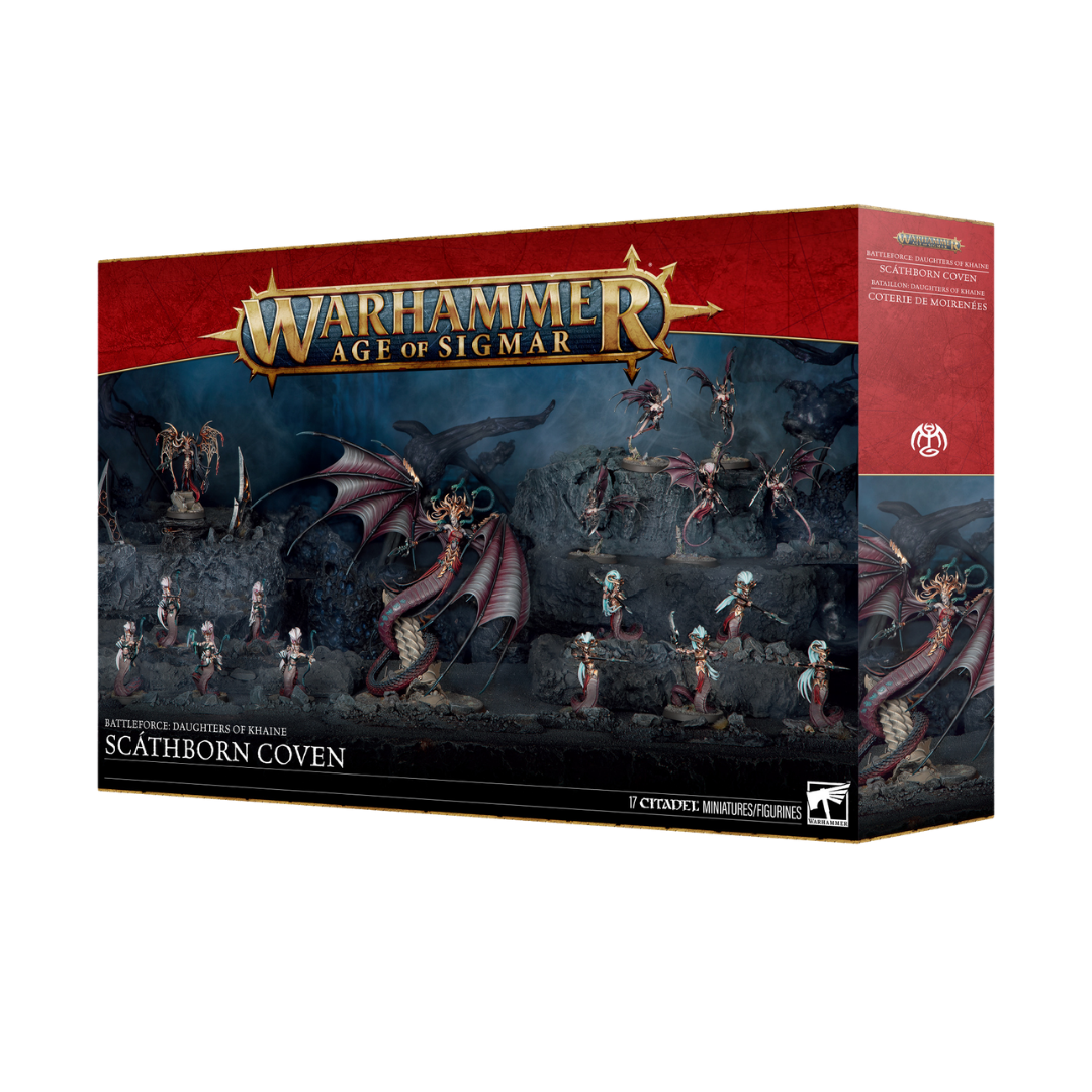 Die Scáthgeborenen sind wahre Töchter von Morathi-Khaine. Sie wurden aus gepeinigten Seelen geboren und sind verdreht und mutiert. Wenn die Schattenkönigin in den Krieg zieht, begleiten diese loyalen Dienerinnen sie und versuchen, ihre Gottheit mit Akten der Grausamkeit und des Blutvergießens zu beeindrucken.