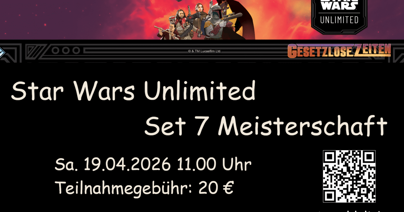 CategoriesEvents März 17, 2026April 4, 2026 Sa. 19.04.2026 – Star Wars Unlimited Set 7 Meisterschaft Set 7 Meisterschaft 19.04.2026 Start 11.00 Uhr Teilnahmegebühr 20 € Anmeldung: im Laden, telefonisch, per Email oder über diesen Anmeldelink Let`s play Wir freuen uns auf euch. BeitragsnavigationPrevious post Sa. 02.05.2026 Demo-Gameday Warhammer: Underworlds und Warhammer: Kill Team