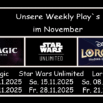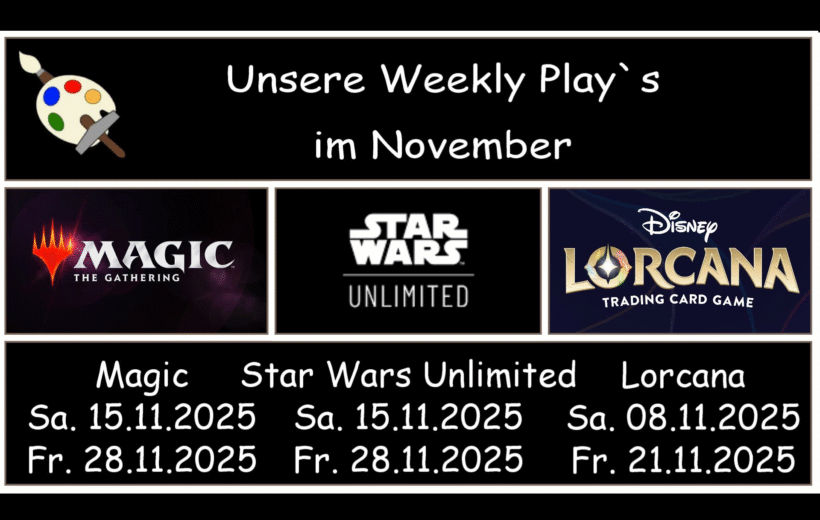 Unsere Weekly Play`s im November Anmeldung: im Laden, telefonisch, per Email oder über den jeweiligen Anmeldelink Star Wars Unlimited Sa. 15.11.2025 ab 11 Uhr und Fr. 28.11.2025 ab 16 Uhr Teilnahmegebühr: 7,00€ Anmeldelink Magic The Gathering Sa. 15.11.2025 ab 11 Uhr und Fr. 28.11.2025 ab 16 Uhr Teilnahmegebühr: 8,00€ Anmeldelink Disney Lorcana Sa. […]